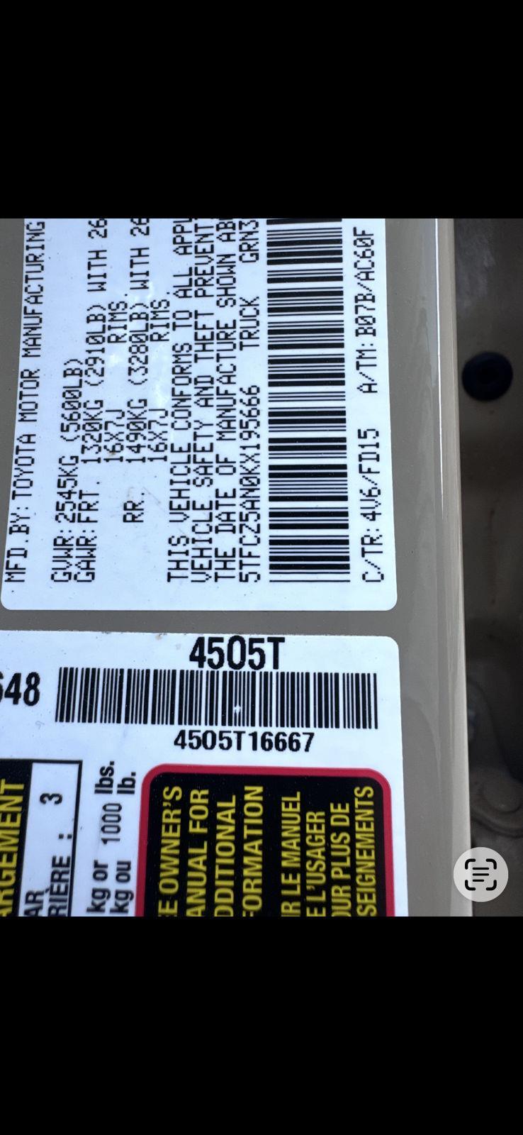 - 5TFCZ5AN0KX195666